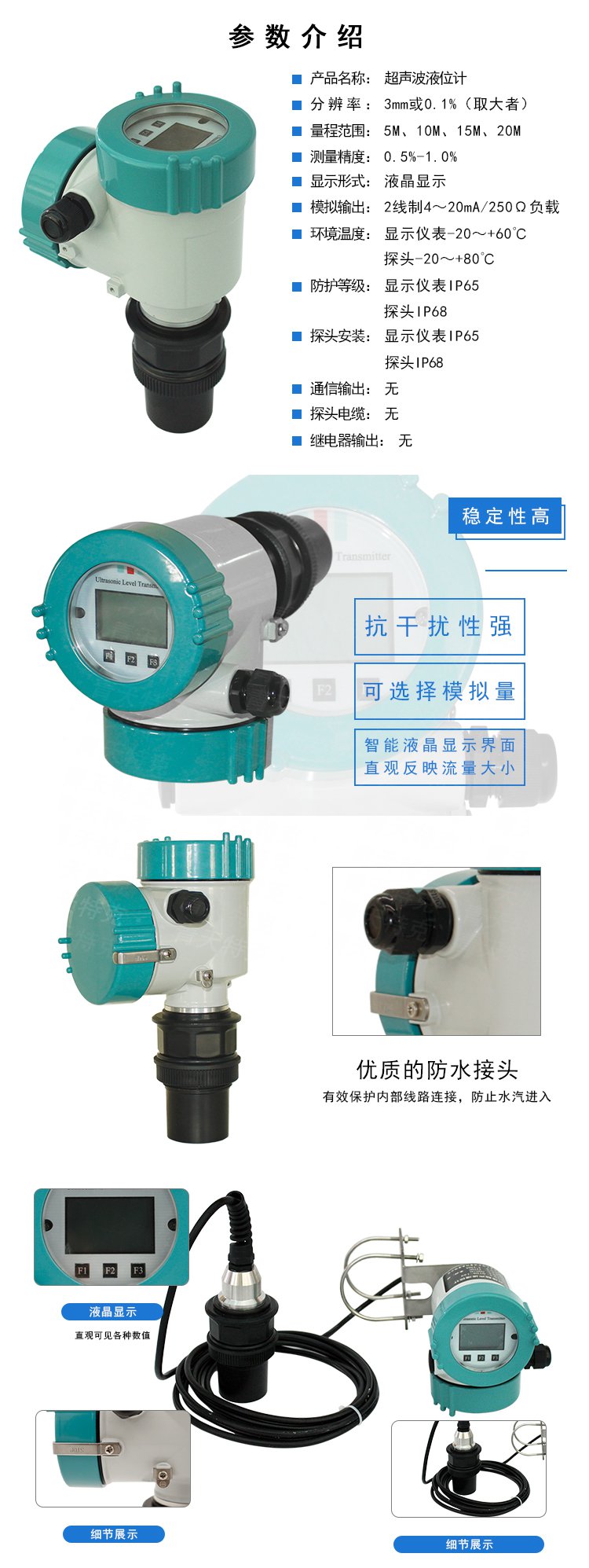 5、多種輸出形式:可編程繼電器輸出、高精度4-20mA電流輸出、Rs-485數字通信輸出分體超聲波液位探頭。